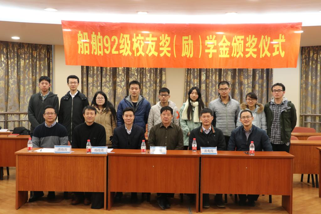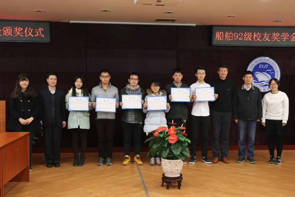 会议首先进行的是奖学金颁奖仪式。3位校友代表为来自3个年级的6名获奖学生颁发了2015-2016学年船舶92级校友奖学金和励学金证书。2013级船舶与海洋工程专业学生张浩然作为获奖代表进行了发言,表达了对92级学长学姐感激之情以及对他们毕业多年仍然心系大工船舶的敬佩之情。