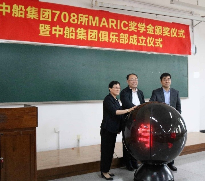 仪式上,朱文华处长、于海晨处长、刘刚书记三位领导共同按下电子启动球,正式为中船集团七〇八所MARIC奖学金颁奖仪式暨中船俱乐部成立仪式揭幕。同时,朱文华处长为中船俱乐部第一届主席团成员颁发聘书,并为大会致辞。