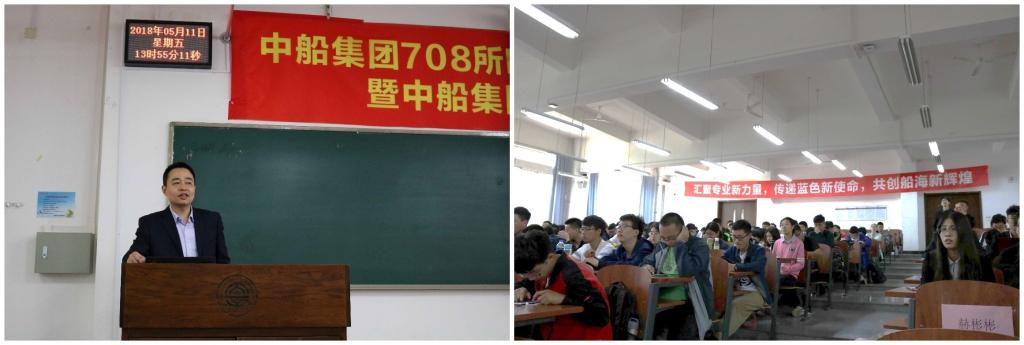 仪式结束后,朱耀胜主任为同学们带来了《海洋强国基石——海洋装备》专题讲座。朱主任首先从最近的热点话题——中美贸易战入手,分析海洋对于世界政治的重要性,充分吸引了在场同学的注意力。随后,朱主任分别从中国的海洋战略、海洋装备产业竞争格局、海洋装备科技发展趋势、新时代大学生使命担当四方面加以介绍,鼓励更多的学生有理想、有担当,投入到国家海军战略建设中,为国家海军作出贡献。