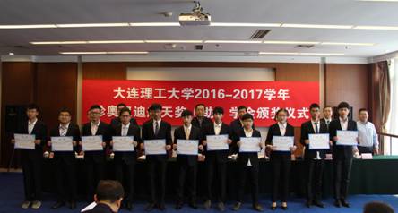 珍奥双迪航天奖(助)学金由中国航天基金会、珍奥集团股份有限公司和大连双迪科技股份有限公司共同在我校设立,用于奖励、资助学习成绩优异、创新能力突出的航空航天相关专业研究生、本科生,激发他们勤奋学习、刻苦攻关、矢志航天。珍奥双迪航天奖(助)学金2017年奖励资助总金额为300000元人民币,其中奖学金总金额为270000元人民币,奖励14名研究生、19名本科生;助学金总金额为30000元人民币,资助10名家庭经济困难本科生。