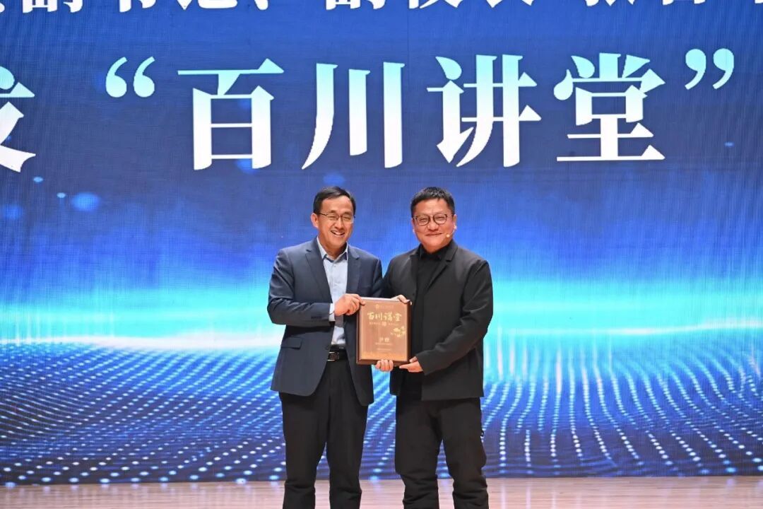 张言军代表学校为尹烨颁发“百川讲堂”纪念牌。