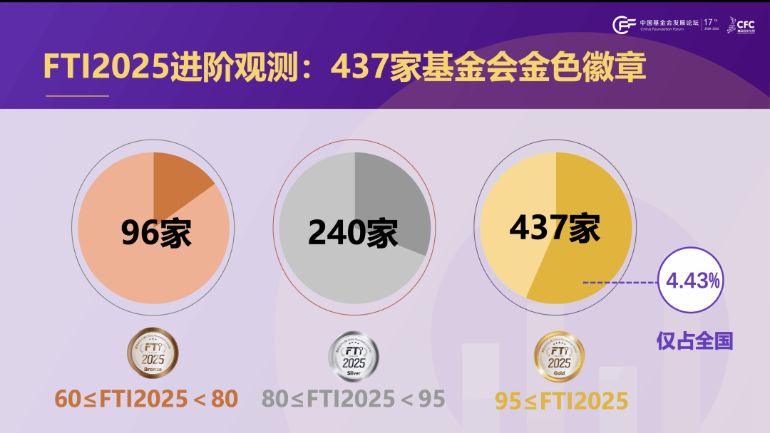 本年度,共有774家基金会进入进阶观测,数量占行业的7%左右。最终全国有437家基金会分数大于等于95,获得了“FTI2025金色徽章”,仅占全国基金会总数的4.43%。