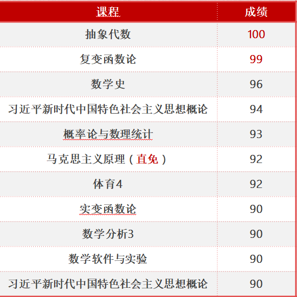 视学习为初恋,将经验广相传:每天早早离开寝室是她始终坚持的习惯,两年来与晨光为伍换来了她优异的学习成绩。大一学年排名专业第二,大二学年14门必修课中有11门达到90分以上,其中抽象代数、复变函数论分别取得了100分和99分的优异成绩,以加权平均分91.32分排名专业第三,保研成绩位列专业第一,超出第二名2.7分。
