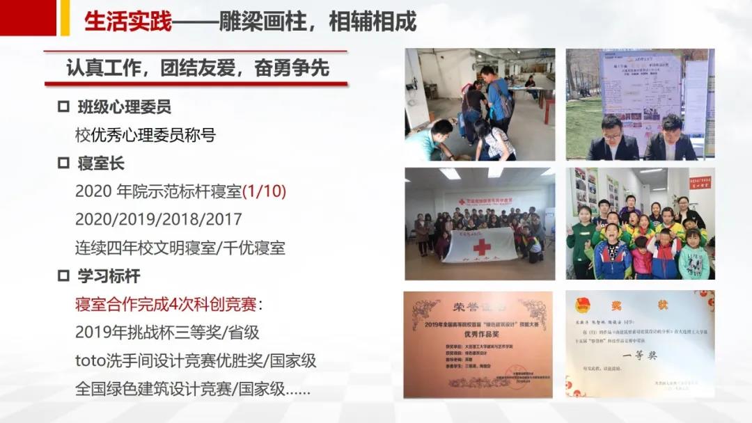 雕梁画柱,相辅相成:在社会实践中,他努力做到全面发展。他积极参与到社会这个大舞台中,顺利完成了2年的社区挂职工作,并在每年的寒暑假积极参与社会实践。他以寝室长的身份融入寝室的文化建设,带动大家共同进步。带领寝室多次获得了校千优寝室、文明寝室等称号,同时寝室共同获得了如设计竞赛优秀奖、攀登杯一等奖等诸多奖项。