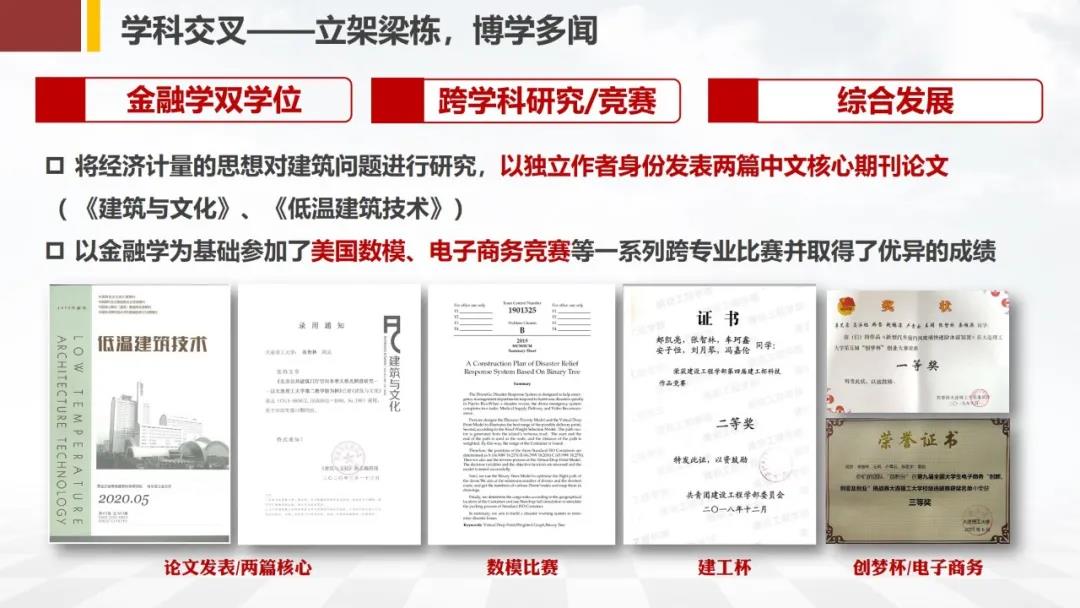立架栋梁,博学多闻:在综合学习上,他努力做到见多识广。他坚持连续三年每周末早8点到晚9点的课程学习,终于拿下了金融学的双学位,让建筑学辅修的不可能变成了可能。金融学的学习使他对建筑设计有了新的思考,他运用经济计量的思想对建筑问题进行研究,并以独立作者的身份发表了2篇核心期刊论文。同时,他以金融学为基础参与了如美国数模竞赛、电子商务竞赛等一系列跨专业比赛并取得了优异的成绩。大学四年,他共修读244学分,涉猎工学、理学、设计学、经济学等方方面面,致力于从全方面认知建筑。