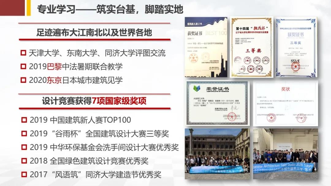 筑实台基,脚踏实地:在专业学习上,他努力做到精益求精。他对建筑设计执着专注,刻苦钻研。曾多次和导师畅谈到深夜,连续一周每天只休息4个小时,只为不到4分钟的答辩能完美呈现。他在建筑设计课上一直保持在年级前三名,90分以上科目共计68门,连续三年总成绩位列年级第一。他更是尝试在更高的舞台上历练自我,曾前往东南大学、同济大学等高校进行交流学习,并先后赴法国巴黎、日本东京进行交流,吸收先进的设计理念并运用到设计实践中,斩获谷雨杯全国设计大赛三等奖、国际大学建造节优胜奖等诸多大奖。