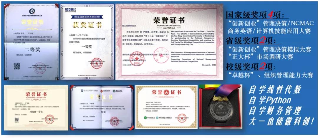 努力尝试,尽力闪耀。科技创新方面,他秉承“求实、创新”的校风。“创新创业”全国管理决策模拟大赛的赛场上他统筹决策,逆风翻盘;“卓越杯”案例分析大赛的展台下他冷静分析,追本溯源;“正大杯”市场调研大赛的荧幕后他广纳信息,求实创新。高等院校数学能力挑战赛全国一等奖是对他踏实严谨学习数学的最好肯定,商务英语知识竞赛全国一等奖是他英语能力大放异彩的最佳开端。、