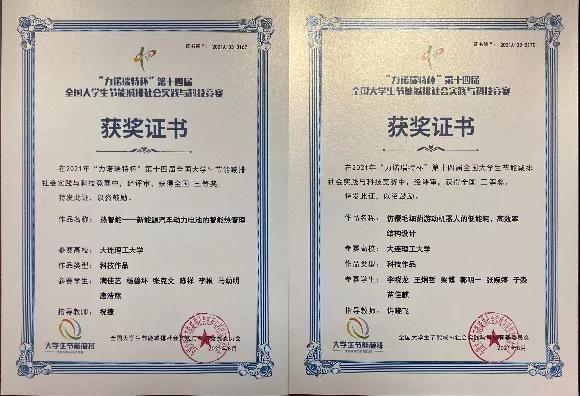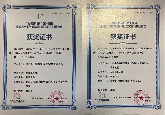 此外,由能源与动力学院祝捷副教授指导,能源与动力学院学生满佳艺、杨碧环、张克文、马幼明、陈祥、唐浩然、李根团队完成的作品——《热智能——新能源汽车动力电池的智能热管理》;由能源与动力学院姜东岳副教授指导,能源与动力学院学生安红、王洪晨、顾龄然、刘佳悦、李烈蔚、张宇恒、张涵团队完成的作品——《面向海洋波浪能的摩擦热释纳米发电机》;由能源与动力学院李林副教授指导,能源与动力学院学生宁文博、孙久元、潘燚、姚源、应东轩团队完成的作品——《一种集潜热利用的高效界面式太阳能海水淡化装置》;由化工学院许晓飞副教授指导,化工学院学生李晓龙、电子信息与电气工程学部学生张婉婷、郭明一、罗志宏,化工学院学生王炯哲、梁博,建设工程学部学生王泽豪团队完成的作品——《仿鞭毛细菌游动机器人的低能耗、高效率结构设计》共四项作品获得三等奖。