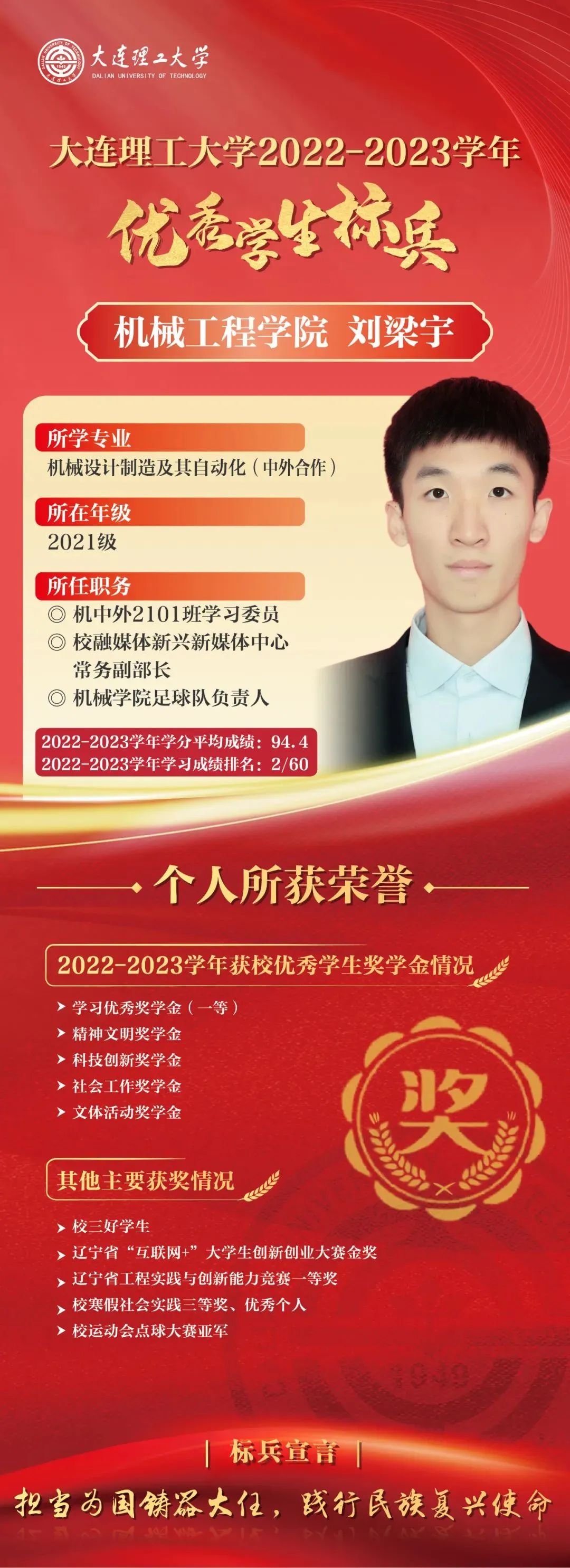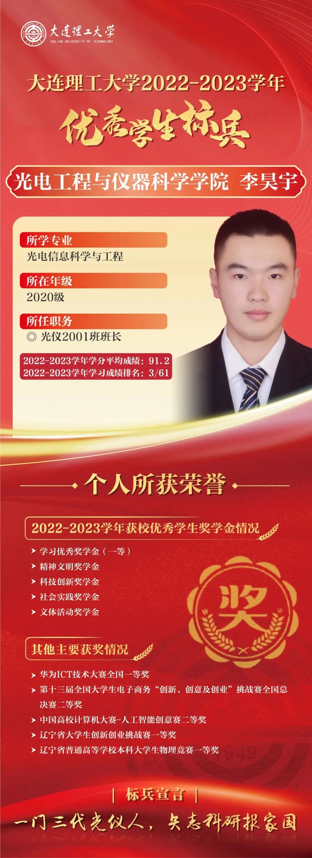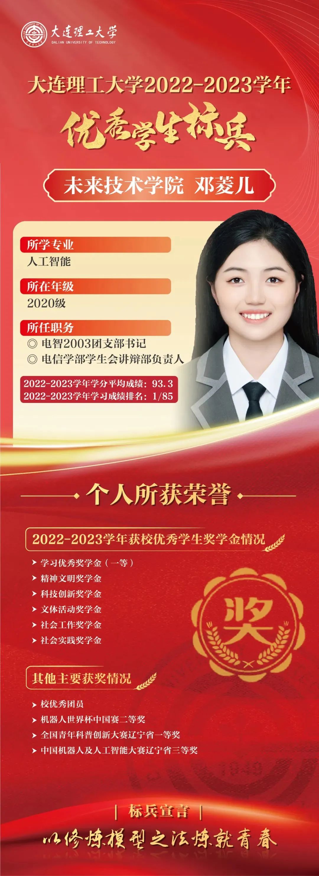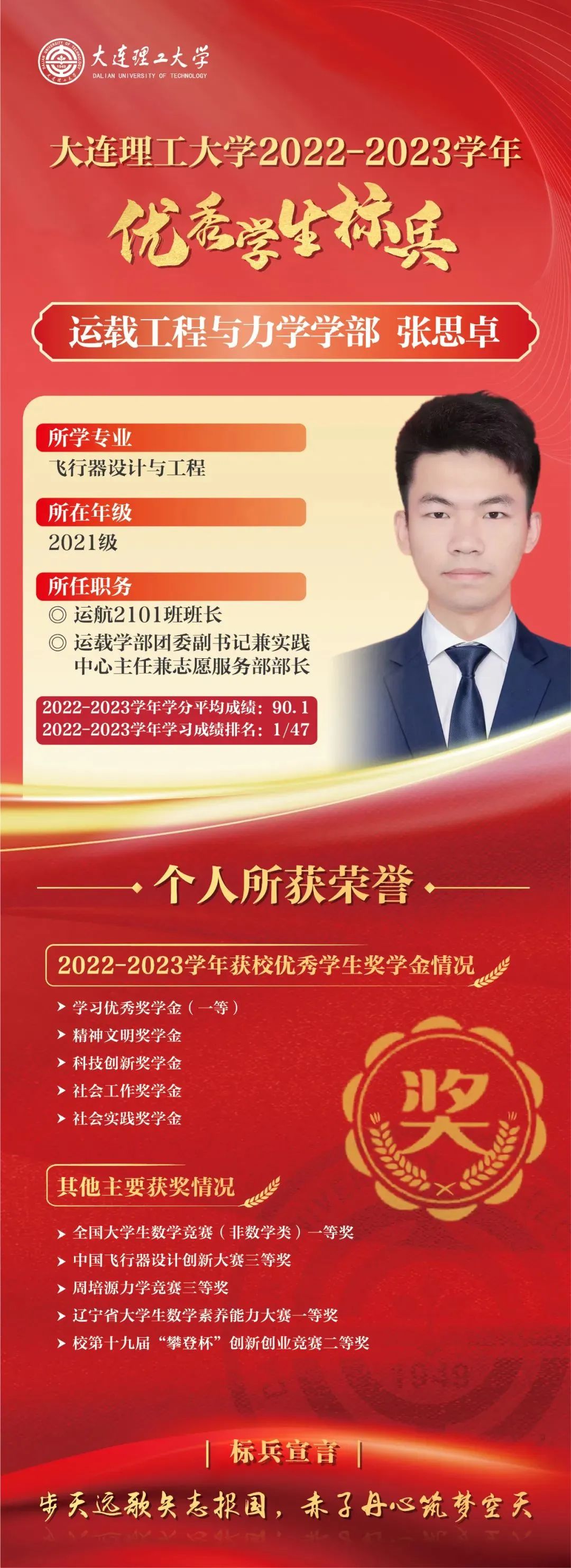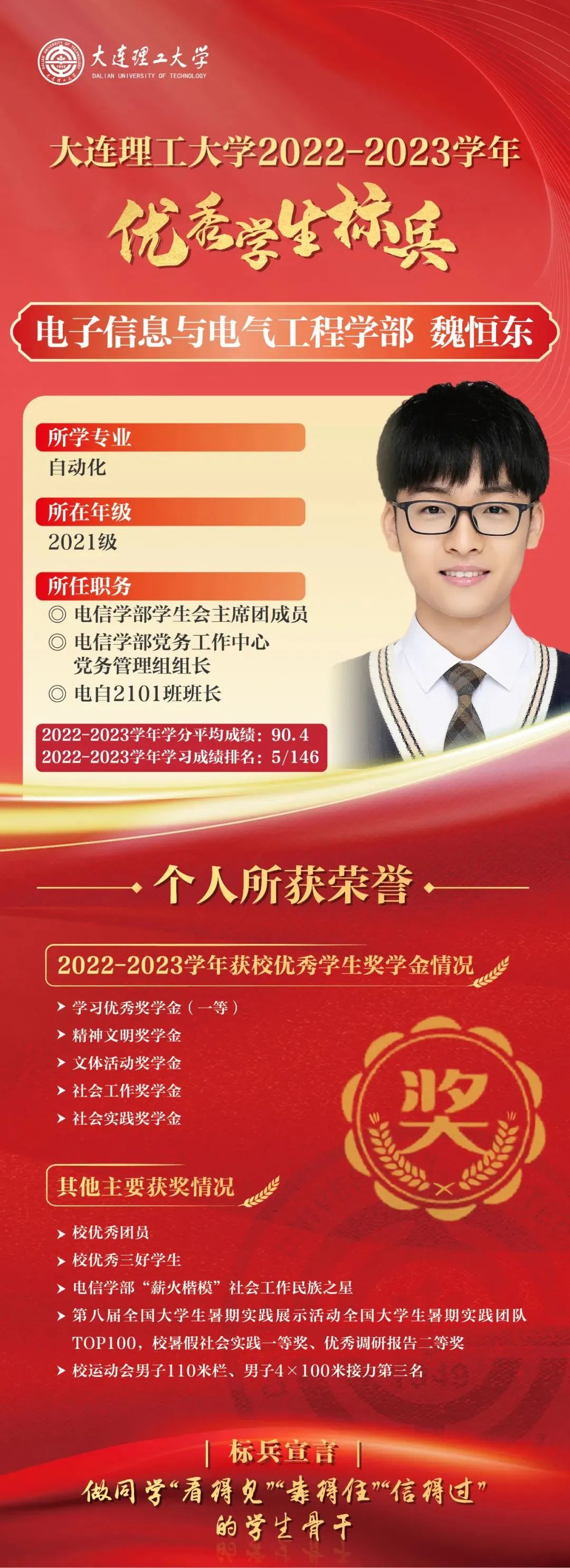 优秀学生标兵是我校面向优秀本科生设置的最高荣誉,已连续评选29年,同时优秀学生标兵将自动获评屈伯川奖学金。屈伯川奖学金是为弘扬老教育家、老校长屈伯川先生的教育思想而设立,继承和发扬屈老的高尚品德和作风,繁荣祖国的科学教育事业,激发大工学子的学习热情,激励大工学子勤奋学习、努力进取、刻苦钻研、不断提高自身素质、全面发展。