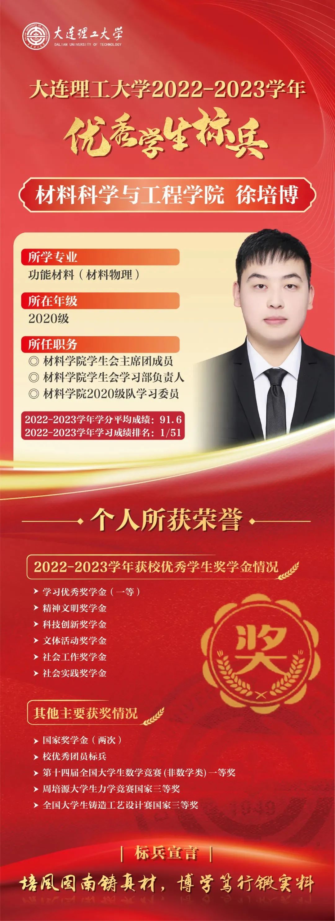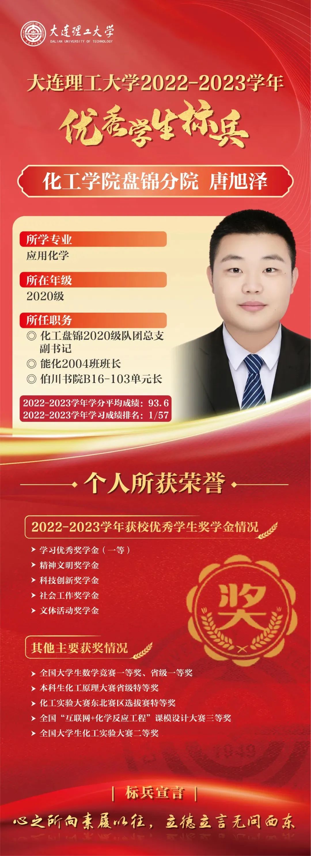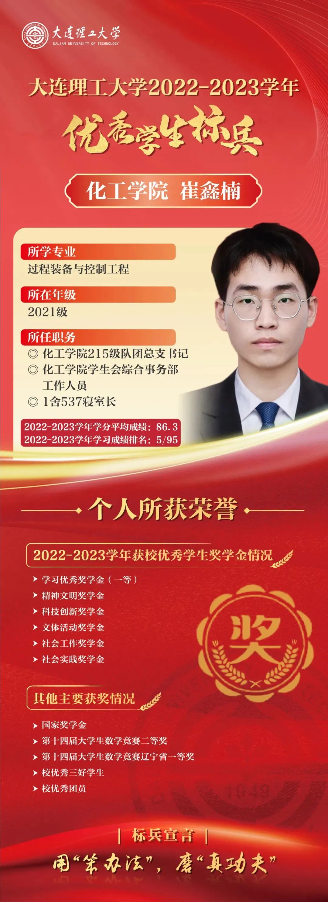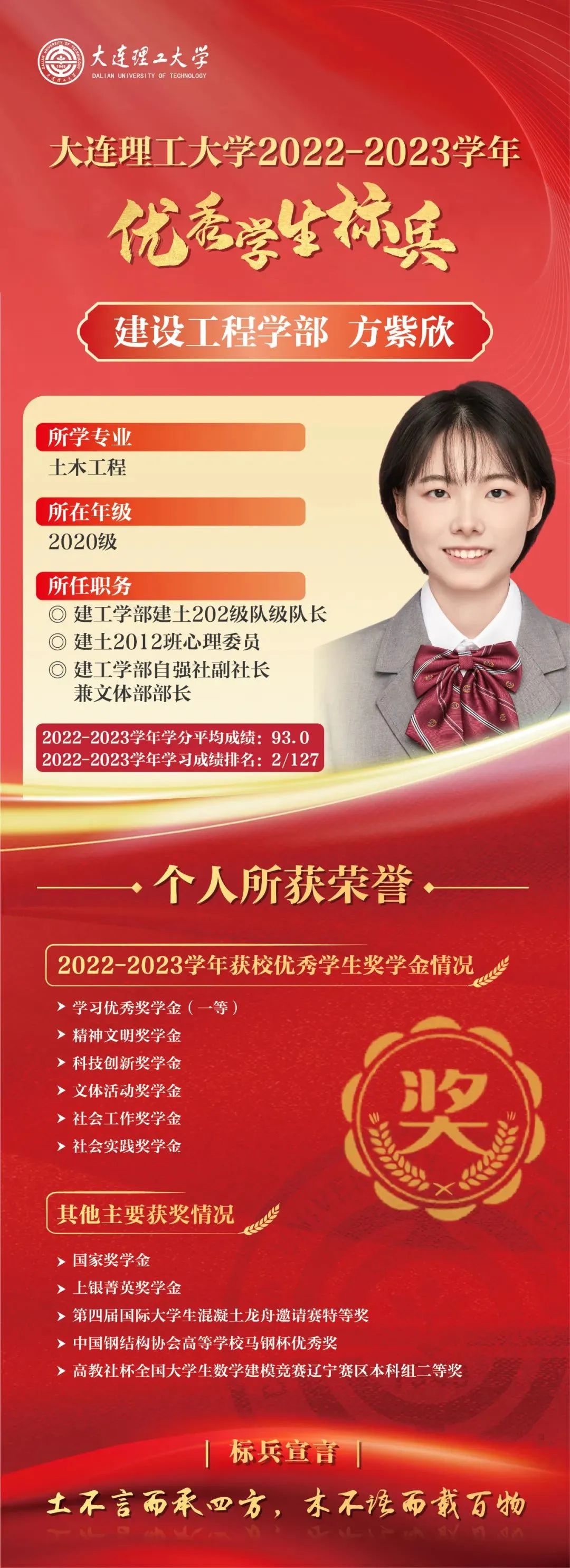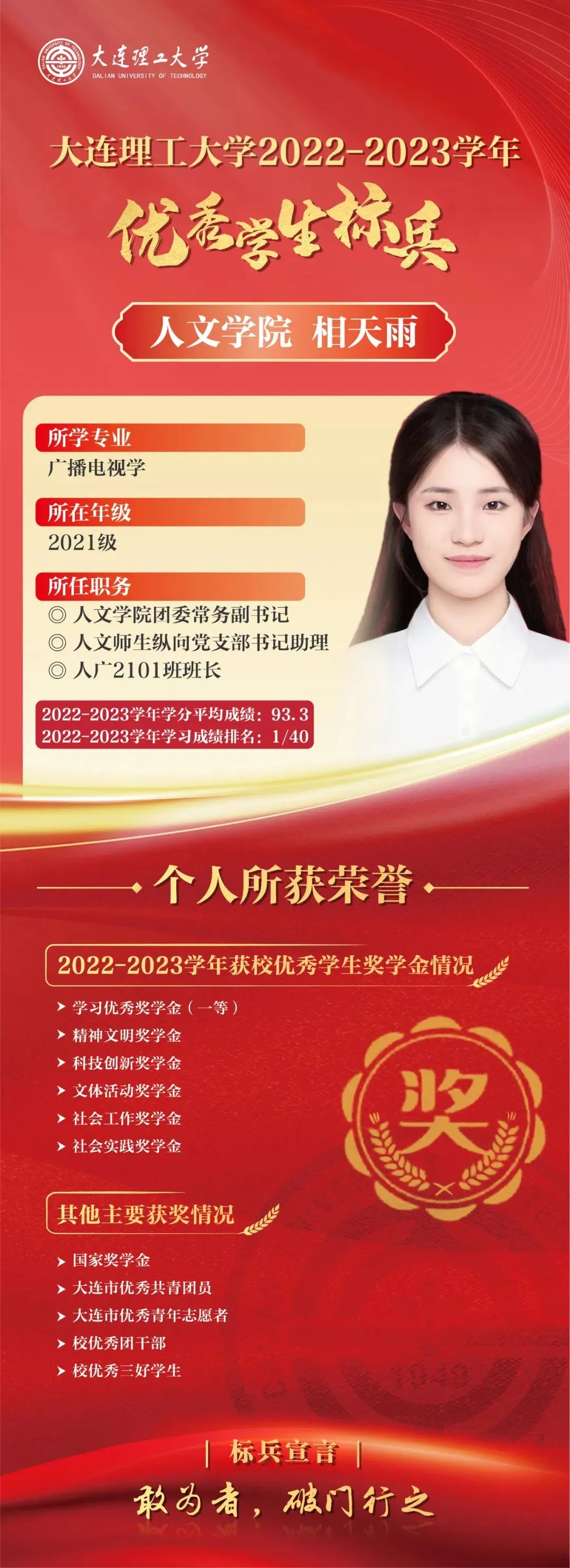 优秀学生标兵是我校面向优秀本科生设置的最高荣誉,已连续评选29年,同时优秀学生标兵将自动获评屈伯川奖学金。屈伯川奖学金是为弘扬老教育家、老校长屈伯川先生的教育思想而设立,继承和发扬屈老的高尚品德和作风,繁荣祖国的科学教育事业,激发大工学子的学习热情,激励大工学子勤奋学习、努力进取、刻苦钻研、不断提高自身素质、全面发展。