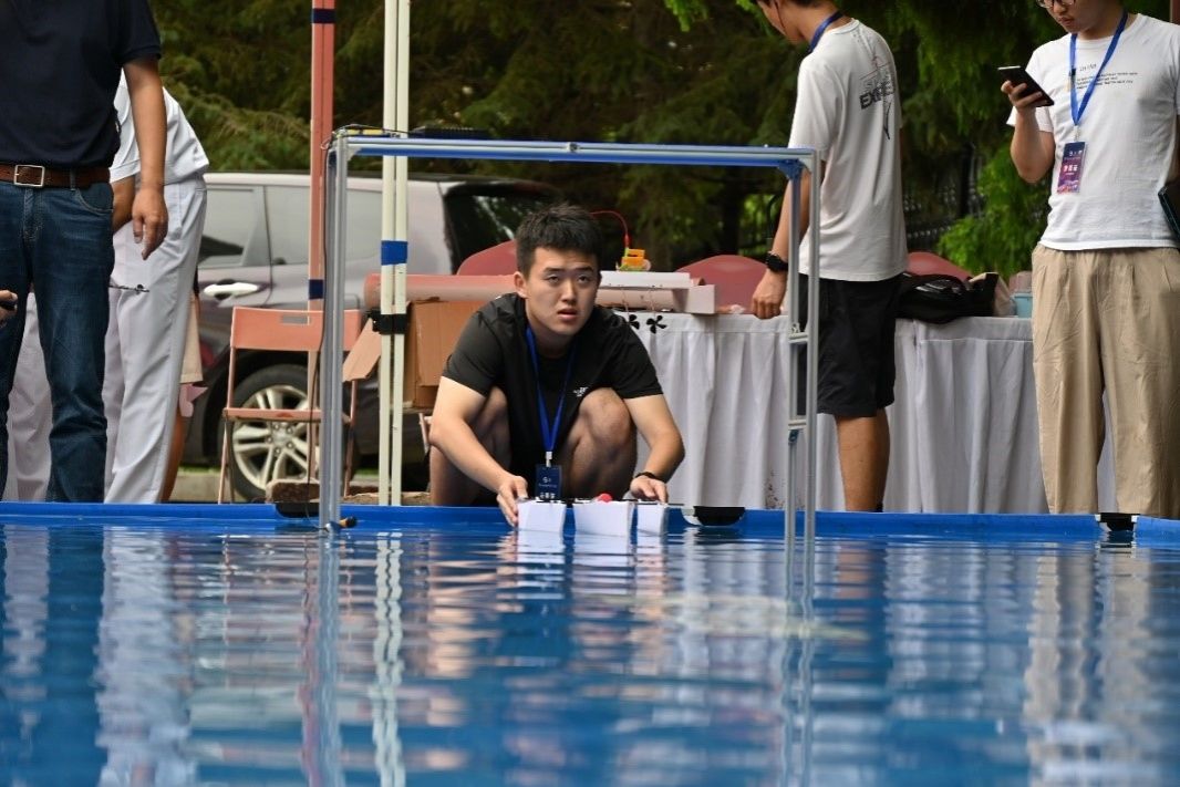 七月滨城,微风习习。室外的比赛中,选手们凭借造型各异、结构精巧的参赛作品,以饱满的热情开始了水上的“实战比拼”。随着第一艘船模入水,E类(船模竞速)比赛正式拉开帷幕。现场水花四溅,欢呼声不断,每一艘船模都凝聚着团队的努力与智慧,在水池里展现出了惊人的速度。面对突发状况时,参赛选手们沉着冷静、积极应对,以过硬的能力灵活调整,表现出色,得到了评委专家的一致肯定。