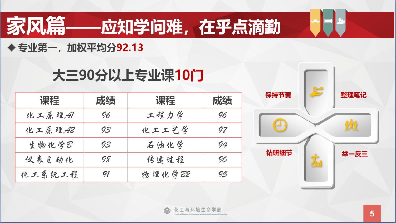廖艺同学敢为人先,以“应知学问难,在乎点滴勤”为勉励,坚持预习加复习学习模式,大三学年拿到了92.13的加权平均分,专业课成绩总评位列专业第一。