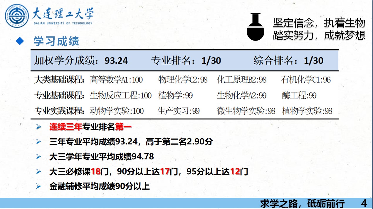 “学习是启动子,是梦的开端”。张琦同学连续三年专业排名第一,大三学年平均成绩达94.78分,连续两年获国家奖学金、校优秀三好学生,3年13项单项奖学金,这是她的拼搏。